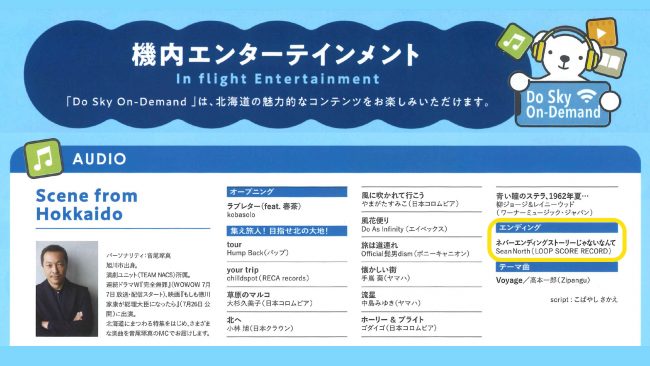 この度、北海道を中心に運航している航空会社AIRDO様の機内オーディオのエンディングテーマとして、 SeanNorthオリジナル楽曲『ネバーエンディングストーリーじゃないなんて』使用されています。 ●番組名…